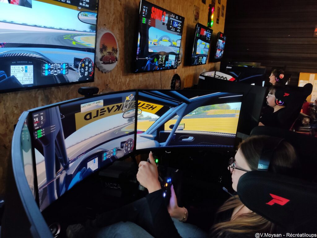 Chaque poste de pilotage dispose d’un triple écran de 32 pouces pour une vision panoramique, d’un pédalier (frein/accélérateur) et d’un volant. Les casques audio connectés permettent aux pilotes de communiquer et de se défier en direct durant la course.