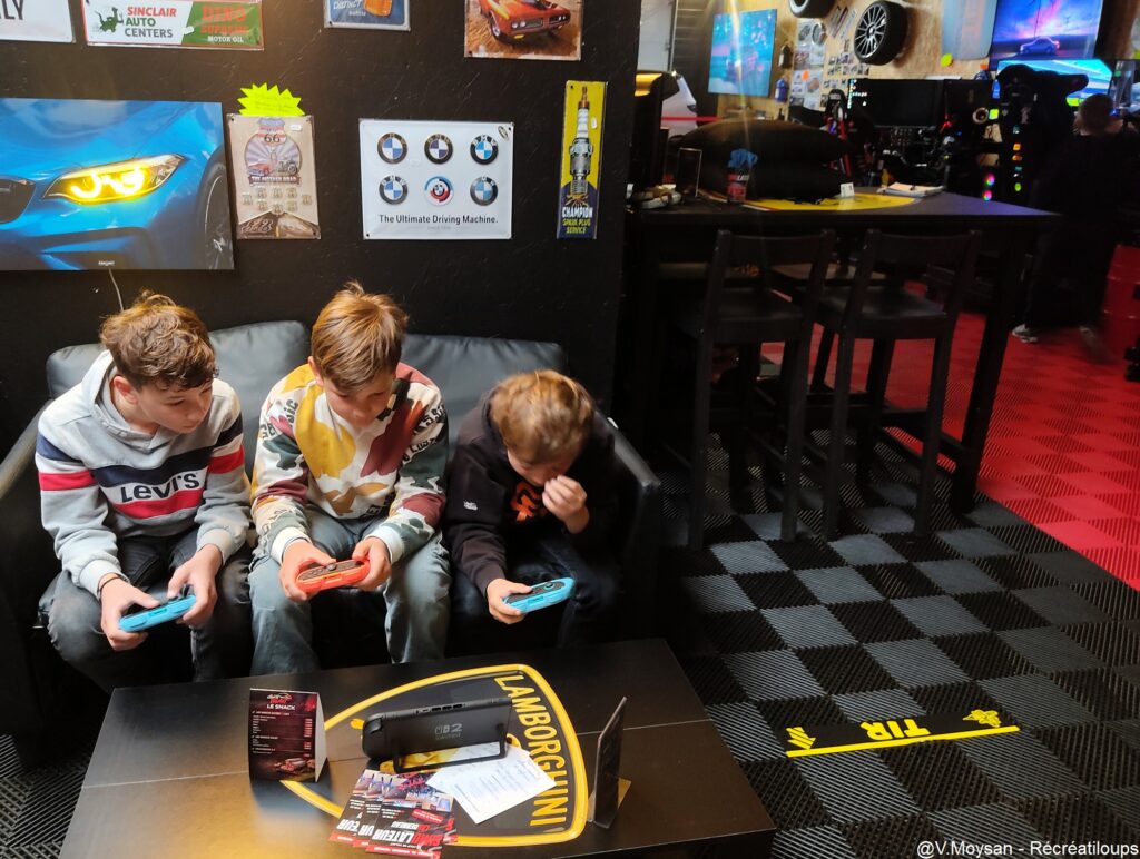 Pour patienter en attendant son tour de pilotage, le centre propose d’autres activités : fléchettes, Nintendo Switch sur tablette ou sur grand écran, et un espace bar pour prendre un verre.