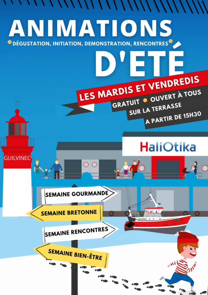 Animations d’été sur la terrasse d’HaliotikaTous les mardis et vendredis de l’été dès 15h30, profitez d’animations variées et gratuites sur la terrasse d’Haliotika au Guilvinec, autour de 4 thématiques : des rencontres, des animations gourmandes, des animations bretonnes, des séances bien-être (une thématique différente chaque semaine) !