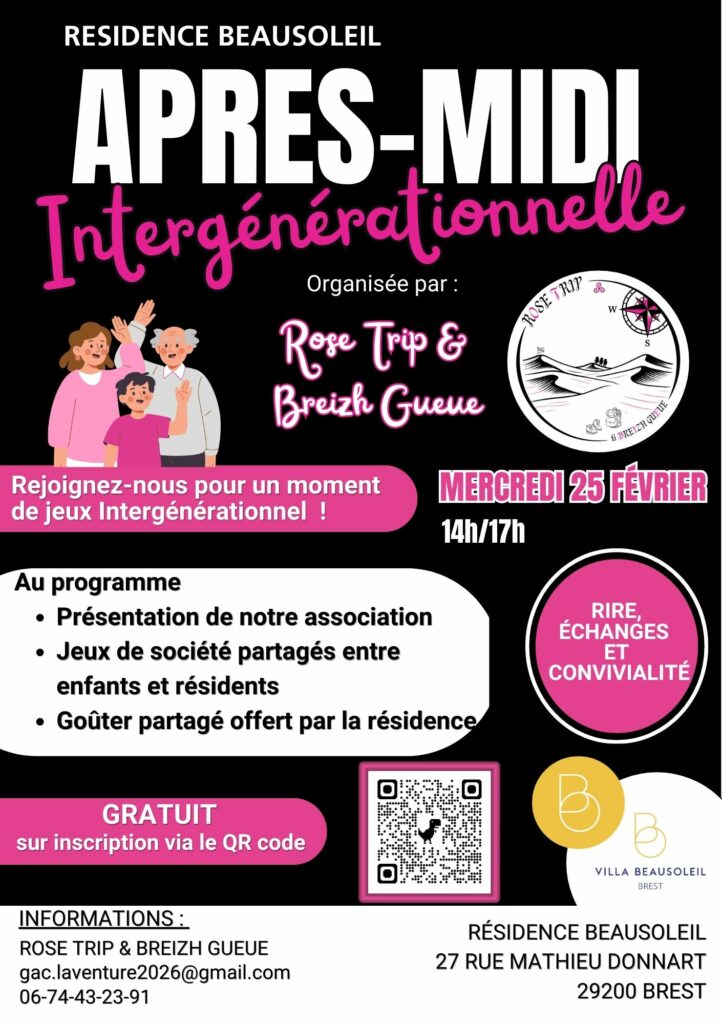 L’association Rose Trip & Breizh Gueue organise une après-midi intergénérationnelle à la Résidence Beausoleil à Brest le mercredi 25 février de 14h à 17h.