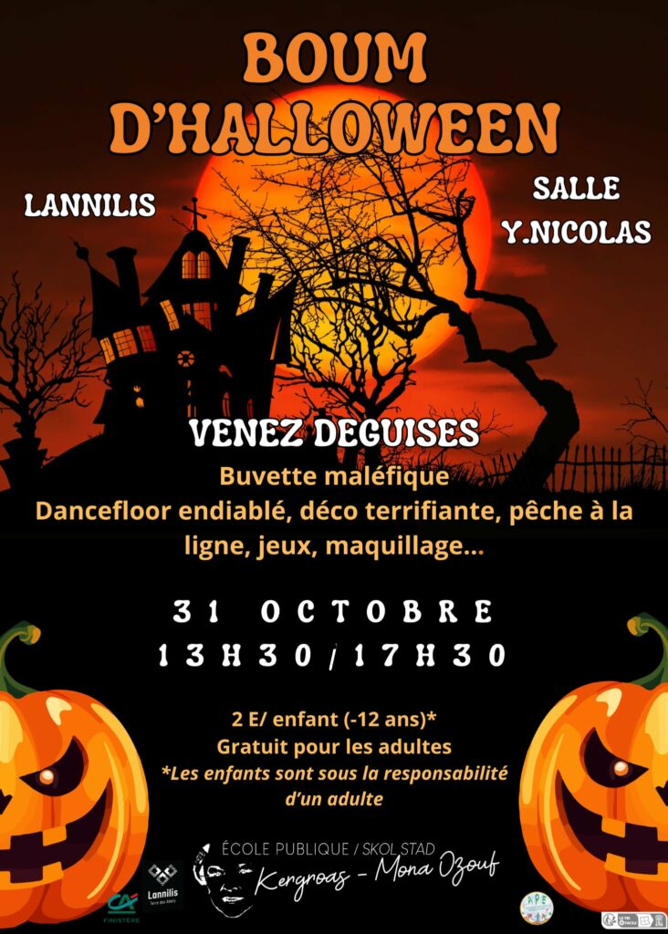 L’école publique de Lannilis organise une boum d’Halloween le 31 octobre de 13h30 à 17h30 à la salle Yves Nicolas. Venez déguisés !
