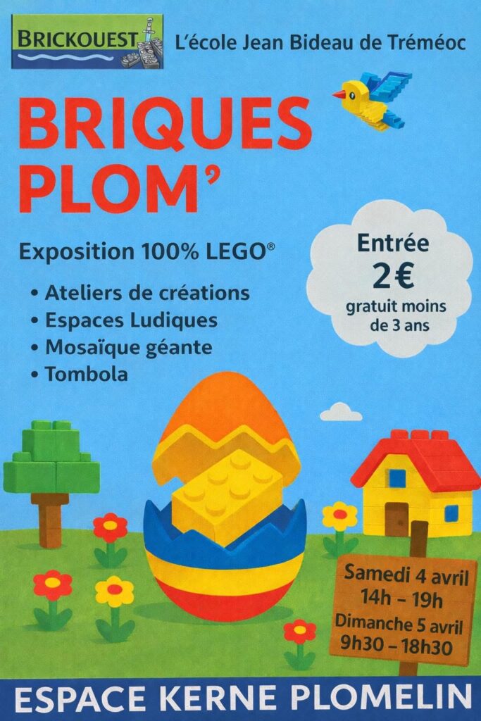 3ème édition de l’exposition de Lego Briques à Plom’, à l’espace Kerné de Plomelin le samedi 4 et dimanche 5 avril 2026, organisée par l’école Jean Bideau de Tréméoc.