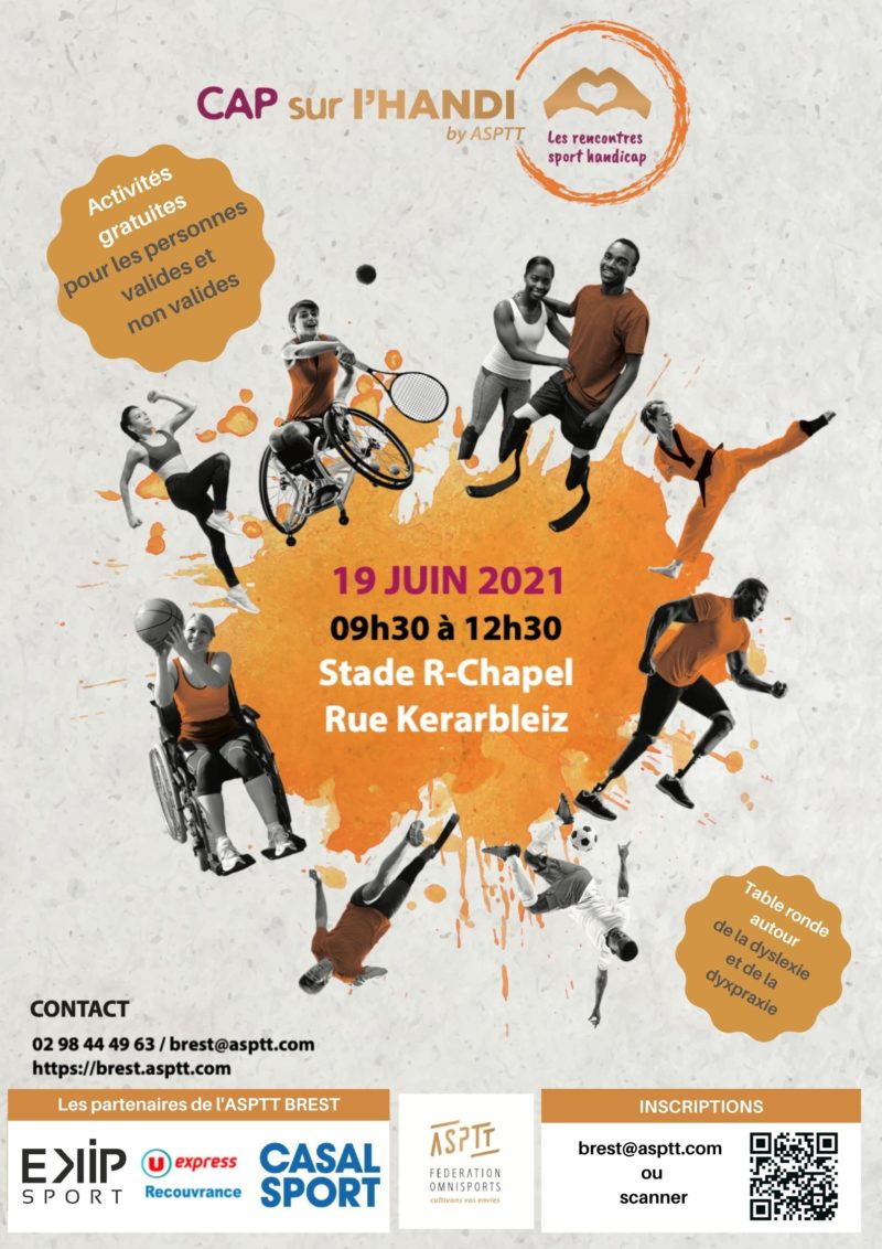 Samedi 19 juin 2021 de 9h30 à 12h30  l’association ASPTT Brest organise l’événement le CAP sur l’HANDI. Il a pour but de sensibiliser les personnes « valides » aux différents handicaps et de créer du lien social.