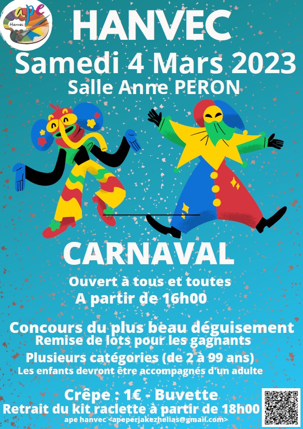 Carnaval à HanvecL’association des parents d’élèves de l’école publique de Hanvec organise un carnaval ouvert à tous le samedi 4 mars de 16h à 18h à la salle Anne Péron à Hanvec.
