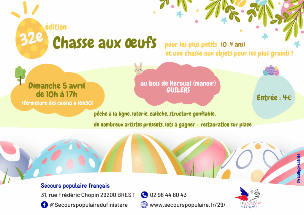 Le Secours populaire de Brest vous donne rendez-vous au bois de Keroual à Guilers le dimanche 5 avril de 10h à 17h pour la 32e édition de sa chasse aux oeufs.