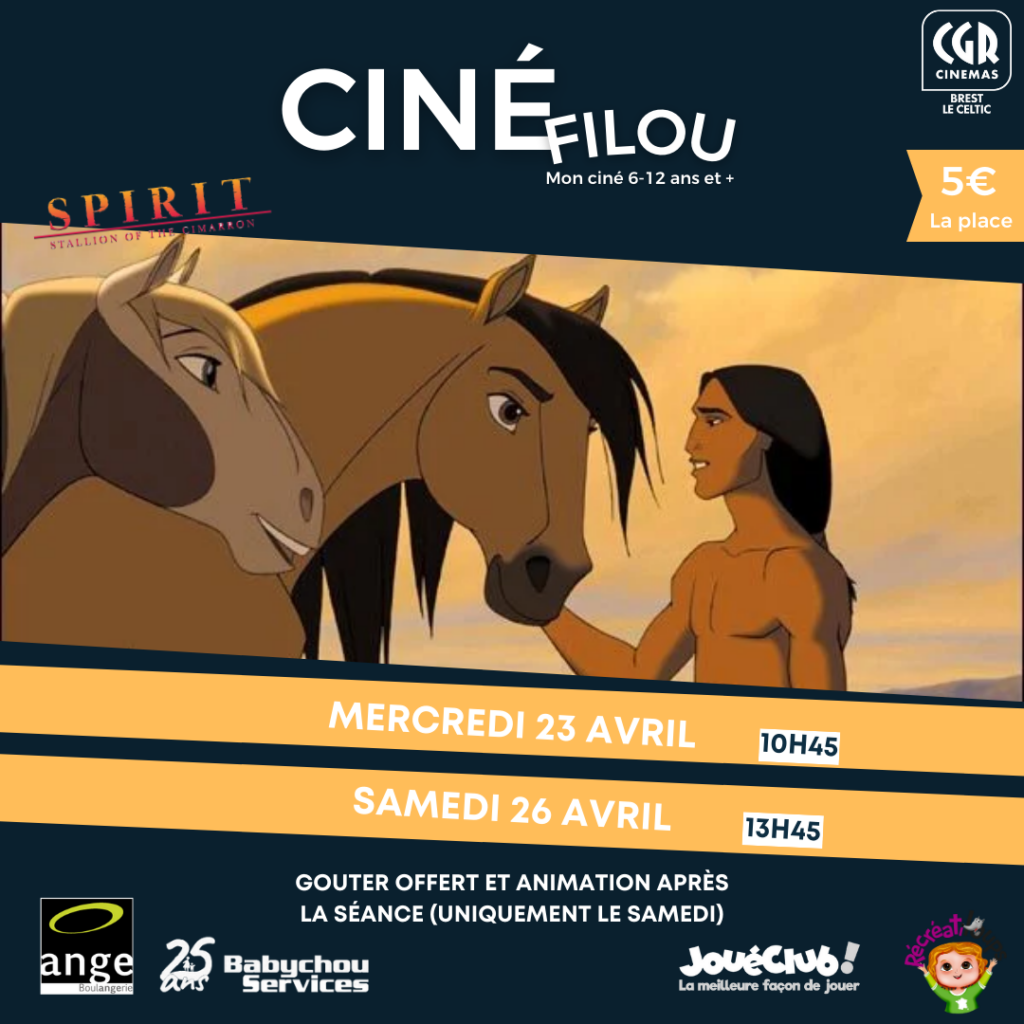Plongez dans l’univers palpitant de SPIRIT, L’ÉTALON DES PLAINES lors des prochaines séances de cinéma Ciné-Filou pour les enfants de 6 à 12 ans au CGR le Celtic à Brest !