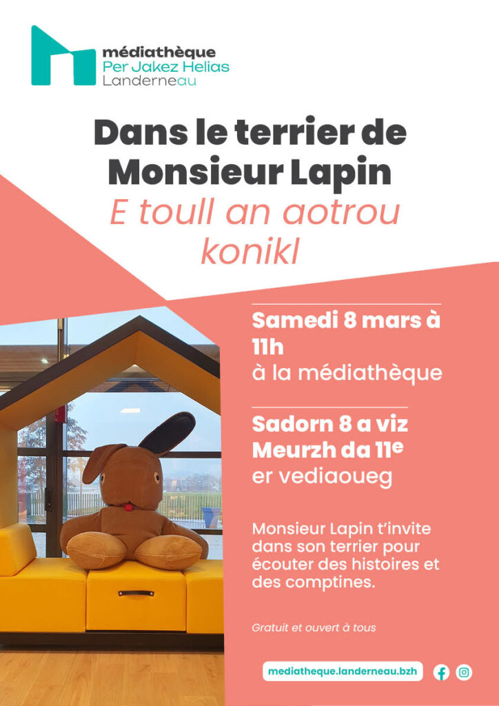 Monsieur Lapin t’invite dans son terrier pour écouter des histoires, des comptines et chanter avec lui et sa copine bibliothécaire, à la médiathèque de Landerneau. Ce rendez-vous lectures est prévu le samedi 8 mars à 11h et s’adresse à tous à partir de 2 ans. Pour cette séance, Monsieur Lapin sera bilingue en breton et en français.
