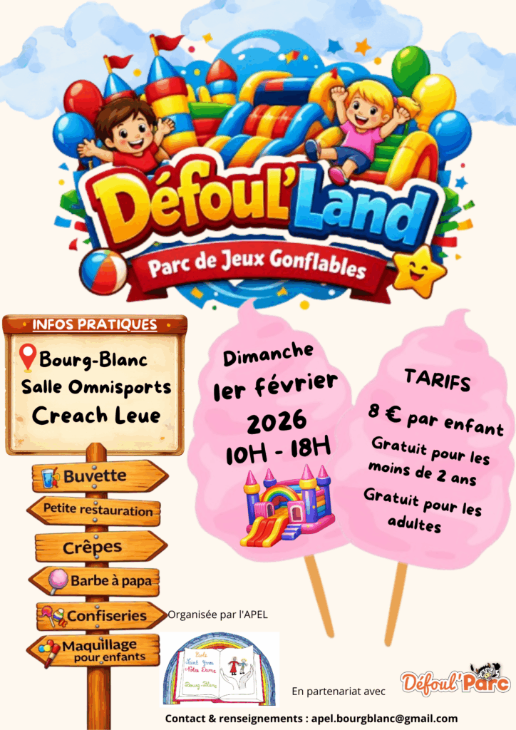Offrez à vos enfants une journée 100 % fun avec Défoul’Land, le parc gonflable éphémère qui débarque à Bourg-Blanc le dimanche 1er février 2026 de 10h à 18h.  Une journée idéale pour se défouler, s’amuser et partager un moment en famille !