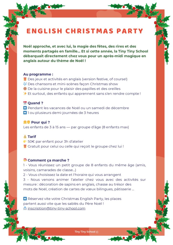 Et si cette année, la Tiny Tiny School débarquait directement chez vous pour un après-midi magique en anglais autour du thème de Noël ! Cette animation est proposée aux enfants de 3 à 15 ans, sur réservation, pendant les vacances de Noël et/ou les samedis de décembre.