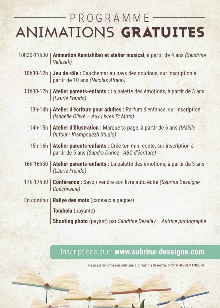 Ce rendez-vous grand public & familial vous permettra de rencontrer de nombreux auteurs auto-édités et de vous faire dédicacer leurs livres, ou encore d’échanger avec des correcteurs, des illustrateurs, … Vous découvrirez tous les métiers autour du livre et de l’écriture : plateformes et logiciels d’écriture, marketing du livre, Bêta lecteurs, coaching littéraire, …