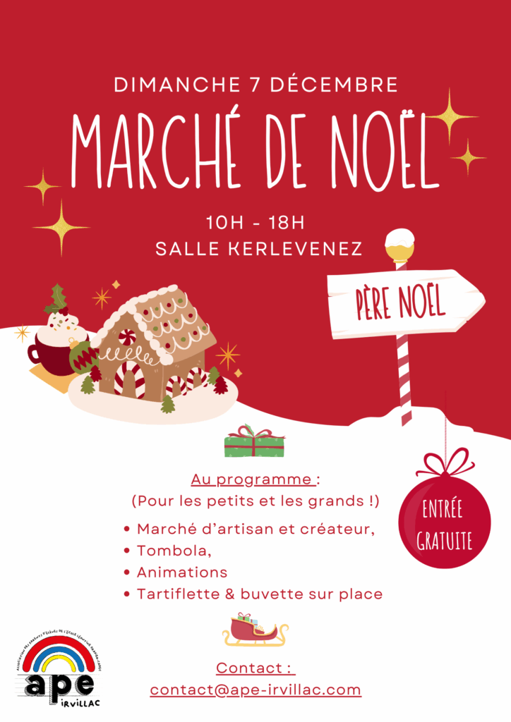 L’Association des Parents d’Élèves de l’école Léontine Drapier Cadec (Irvillac) vous invite à son marché de Noël le dimanche 7 décembre 2025 à la salle Kerlevenez, Irvillac, de 10h à 18h.