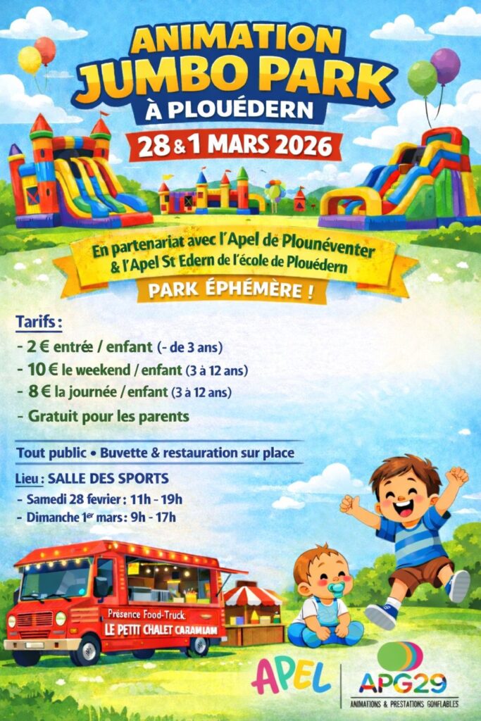 L’APEL de Plounéventer & l’APEL St Edern de l’école de Plouédern organisent un week-end de structures gonflables à la salle omnisports de Plouédern le samedi 28 février et le dimanche 1er mars 2026.