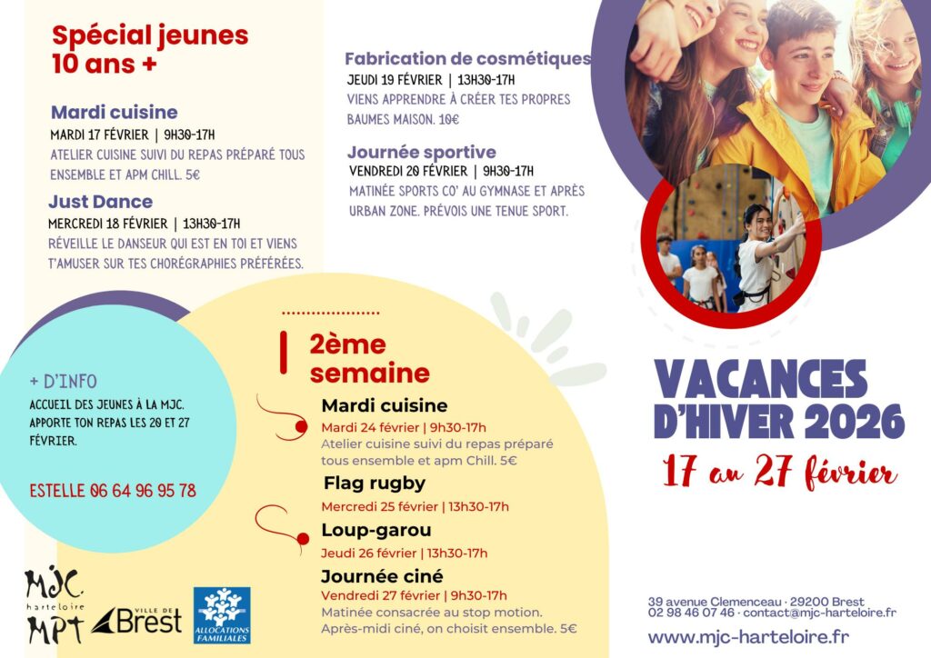 En recherche d’idées pour occuper vos enfants et ados pendant les vacances scolaires ? Découvrez ci-dessous le programme jeunesse concocté par la MJC de l’Harteloire à Brest ! Cuisine, atelier cosmétique, sport, journée ciné, etc… des activités qui nulle doute plairont à vos jeunes !