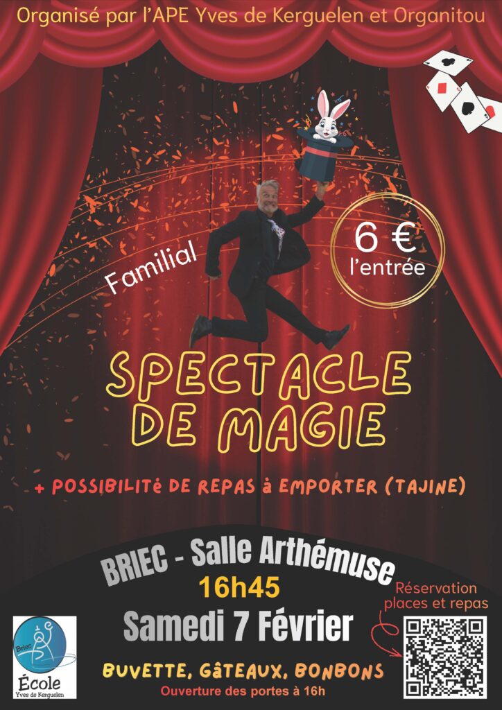 Pour réserver votre spectacle et/ou votre repas, suivez le lien (attention, vous avez jusqu’au 31 janvier pour réserver) : https://ape-des-ecoles-publiques-yves-de-kerguelen-briec.s2.yapla.com/fr/event-99371